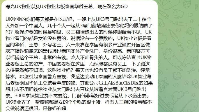中国的老板在这里一点保障都没有员工一下子跑这么多竟然都不知道。这叫物业吗?每天水也没有员工都不能洗澡。经常停水。希望引起泰国警方重视,我这边会动用泰国的人脉铲除UK物业幕后老板泰国华侨王总披着羊皮的狼。